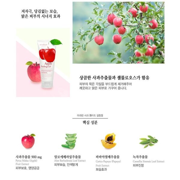 Được chiết xuất chủ yếu từ táo đỏ giúp loại bỏ các tế bào chết, giảm thâm nám và các vết sạm, ngăn ngừa mụn, se khít lỗ chân lông, giảm nếp nhăn, kích thích quá trình hình thành tế bào da mới, da sẽ trở nên mịn màng, tươi sáng và trẻ trung. Tẩy da chết Arahan dùng cho da mặt và toàn thân.